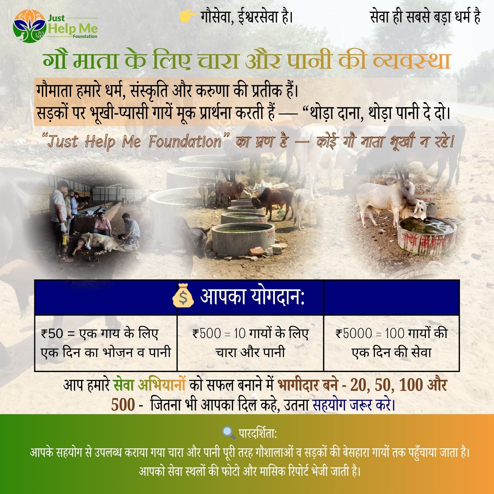 “Just Help Me Foundation” का प्रण है — कोई गौ माता भूखी न रहे।
